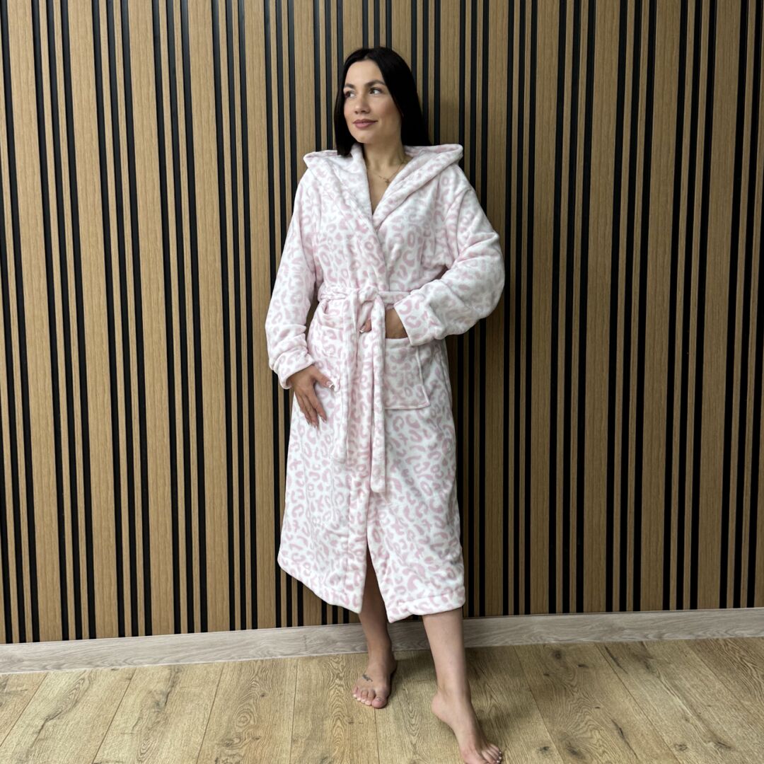 Теплий халат для дому – ваш комфорт та затишок кожного дня. В нього приємно загорнутися після насиченого дня. Виріб теплий, м’який та дуже приємний на дотик. Виконаний у довгому крої нижче коліна, з капюшоном там кишенями.