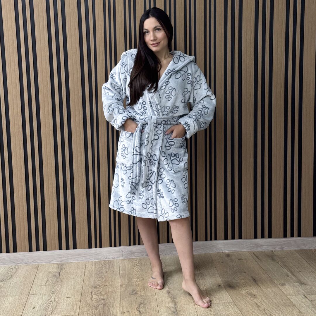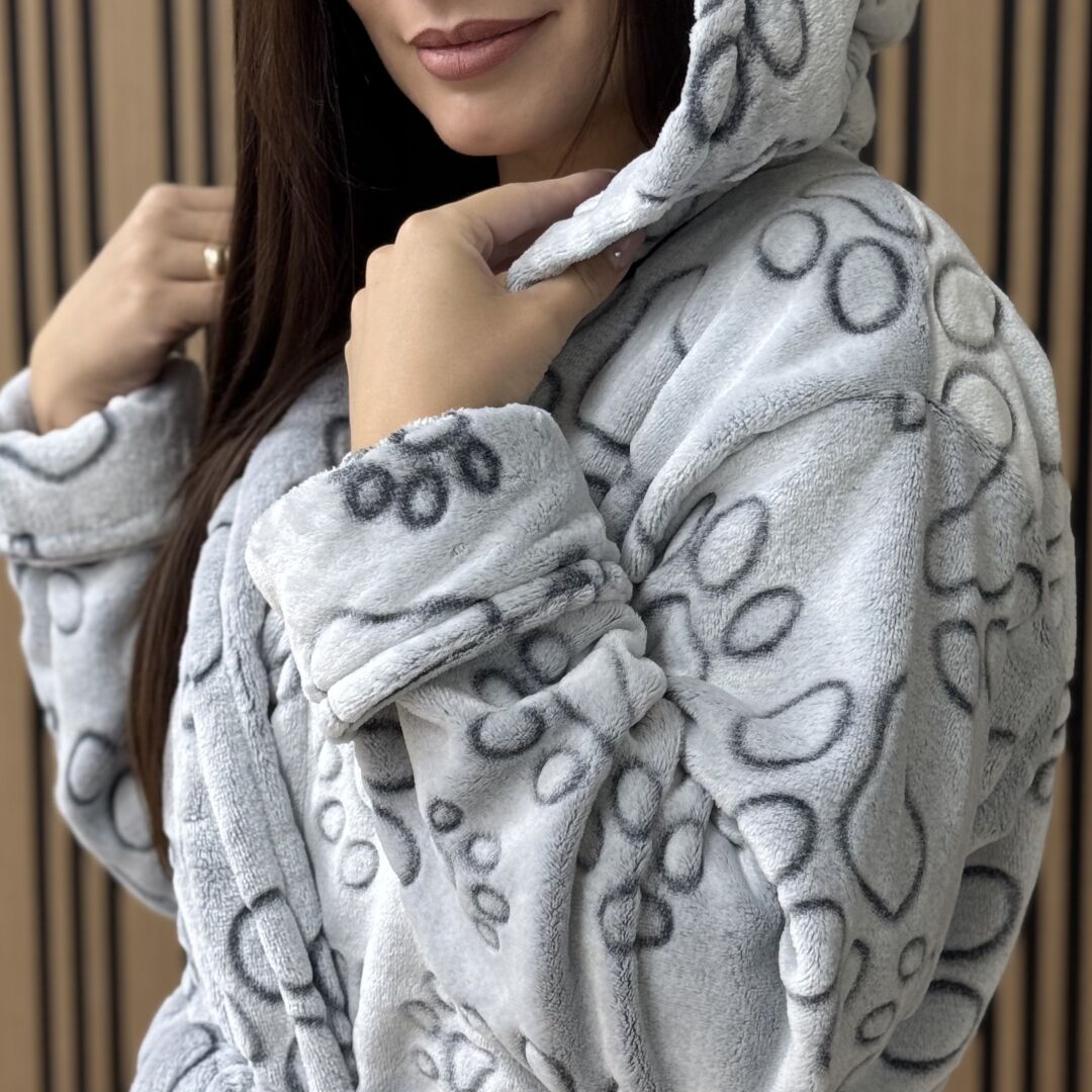 Халат пошитий в короткому дизайні «на запах» з поясом та двома глибокими кишенями, а також капюшоном. Даний виріб є незамінним дома. Адже, він комфортний, теплий та зручний у використанні. Сам дизайн виконаний дуже красиво та стильно за рахунок вишитих котячих лапок, які роблять халат об’ємним, тому його володарка буде виглядати незрівнянною вдома.