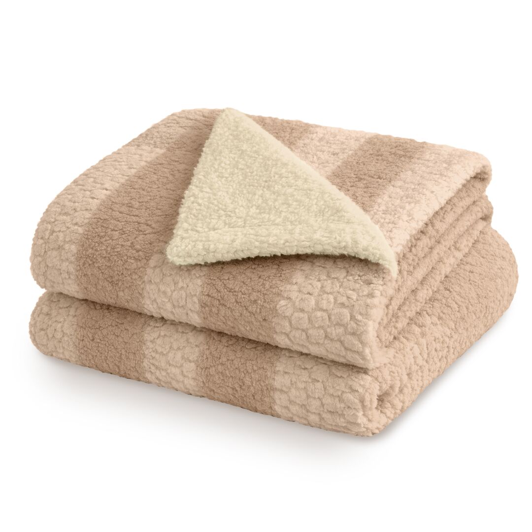 Це двосторонній плед шерпа зі смужками, який має м'яку флісову текстуру з одного боку та пухнасту, схожу на овчину, підкладку шерпа з іншого.